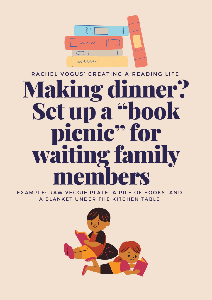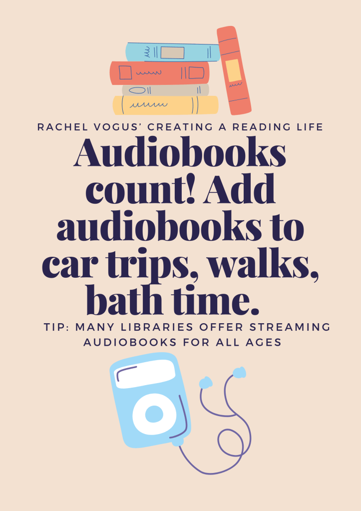 It might feel strange to keep a book next to the sink, but you can pick up a book instead of your phone while you brush your teeth in the morning and at night. Pick one phone-swiping session and commit to using it to read instead. Do this everyday! At the end of the week, I bet you will have read more than you did last week!Make “book picnics” an every-day activity to replace a time when your children are waiting for you to finish something. Explain what you’re doing and why. Let kids know that this is a real strategy that adult readers use to pass the time & get more reading into their day. Audiobooks are a great way to ignite or re-ignite a love of reading. Don’t be afraid they “don’t count.” Children still learn about genre, character, plot, and many other important literacy elements through listening to audiobooks. Ask your local librarian for a recommendations for your household!