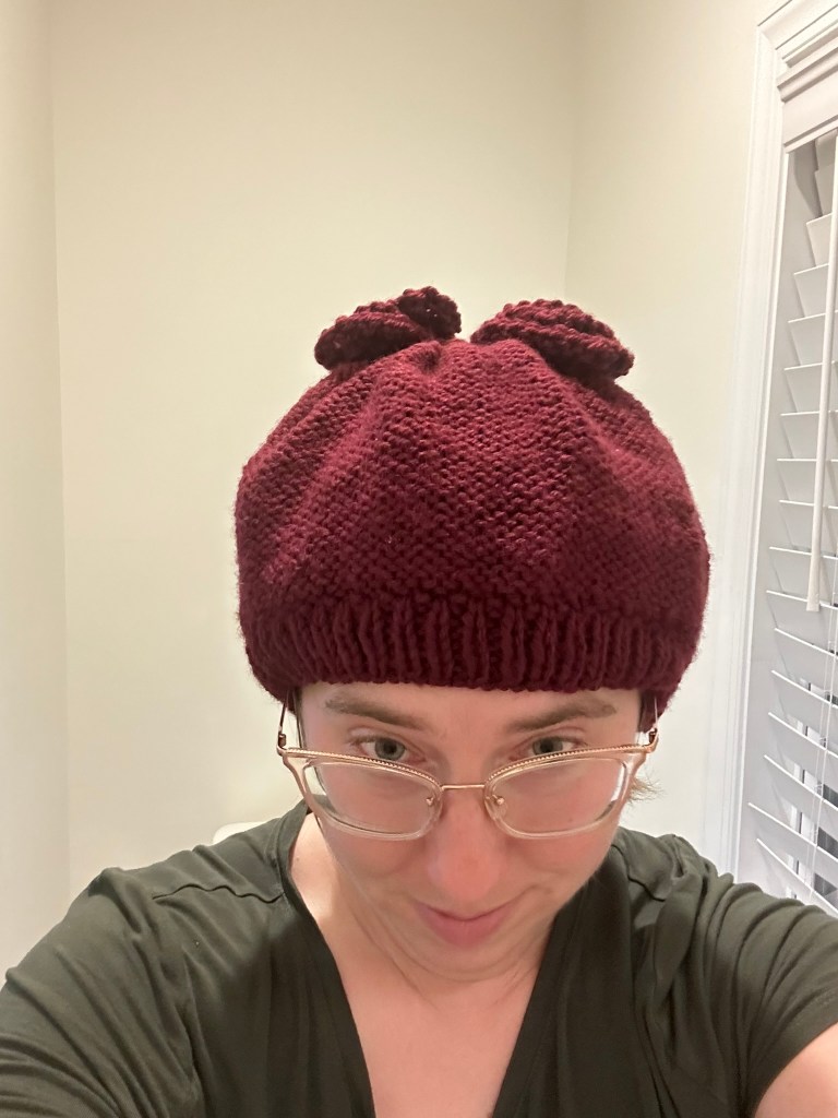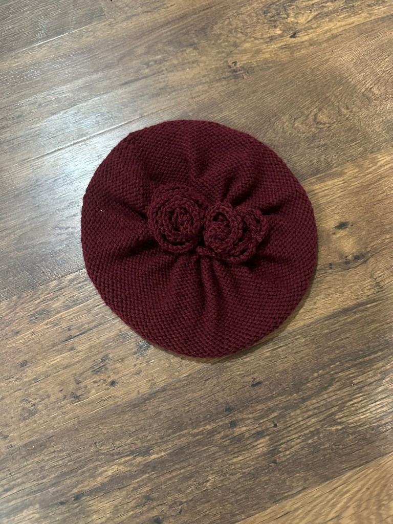This red hat with flowers on it was almost a knitting disaster. I used double pointed needles for first time in order to do the decrease. The crown wound up full of holes. Either I dropped a bunch of stitches or something else went wrong. I covered the holes with these knitted “flowers.”